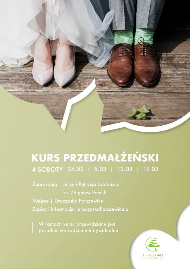 SERDECZNIE ZAPRASZAMY NA KURS PRZEDMAŁŻEŃSKI W OŚRODKU KONFERENCYJNO-REKOLEKCYJNYM W PORSZEWICACH. KURS BĘDZIE OBEJMOWAŁ 4 SPOTKANIA W 4 SOBOTY: 26.02., 05.03., 12.03., 19.03. W GODZINACH 10.00-14.00. W ramach kursu przewidziane jest poradnictwo rodzinne indywidualne. Szczegółowe informacje i zapisy: uroczyskoporszewice.pl/kurs-przedmalzenski-w-porszewicach/