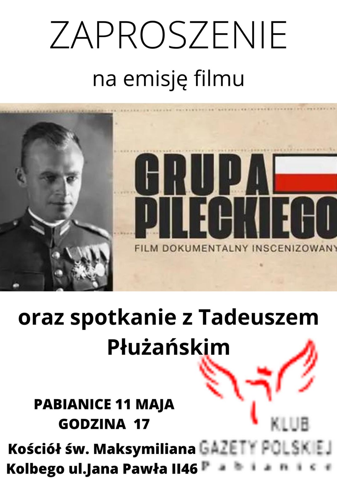 Klub Gazety Polskiej zaprasza na film „Grupa Pileckiego” oraz spotkanie z Tadeuszem Płużańskim dnia 11 maja godz. 17.00 w sali audiowizualnej w naszym kościele.