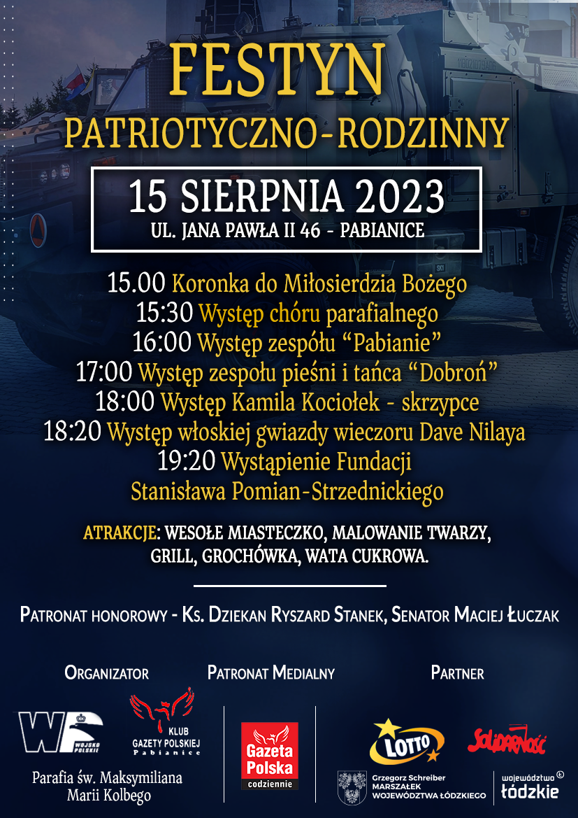 DetailsDnia 15 sierpnia 2023 roku zapraszamy na Festyn Patriotyczno-Rodzinny z okazji Wniebowzięcia Najświętszej Marii Panny, Dnia Wojska Polskiego, i rocznicy Bitwy Warszawskiej. Festyn odbędzie się na terenie naszej parafii w godzinach 15- 20. Zapraszamy.
