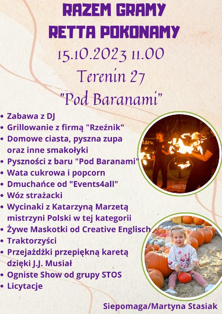 15.10 o godz. 11.00 w Tereninie „Pod Baranami” odbędzie się festyn charytatywny „Razem gramy Retta pokonamy”, aby zdobyć środki na leczenie Martynki Stasiak. Zachęcamy do udziału i wsparcia tej akcji.
