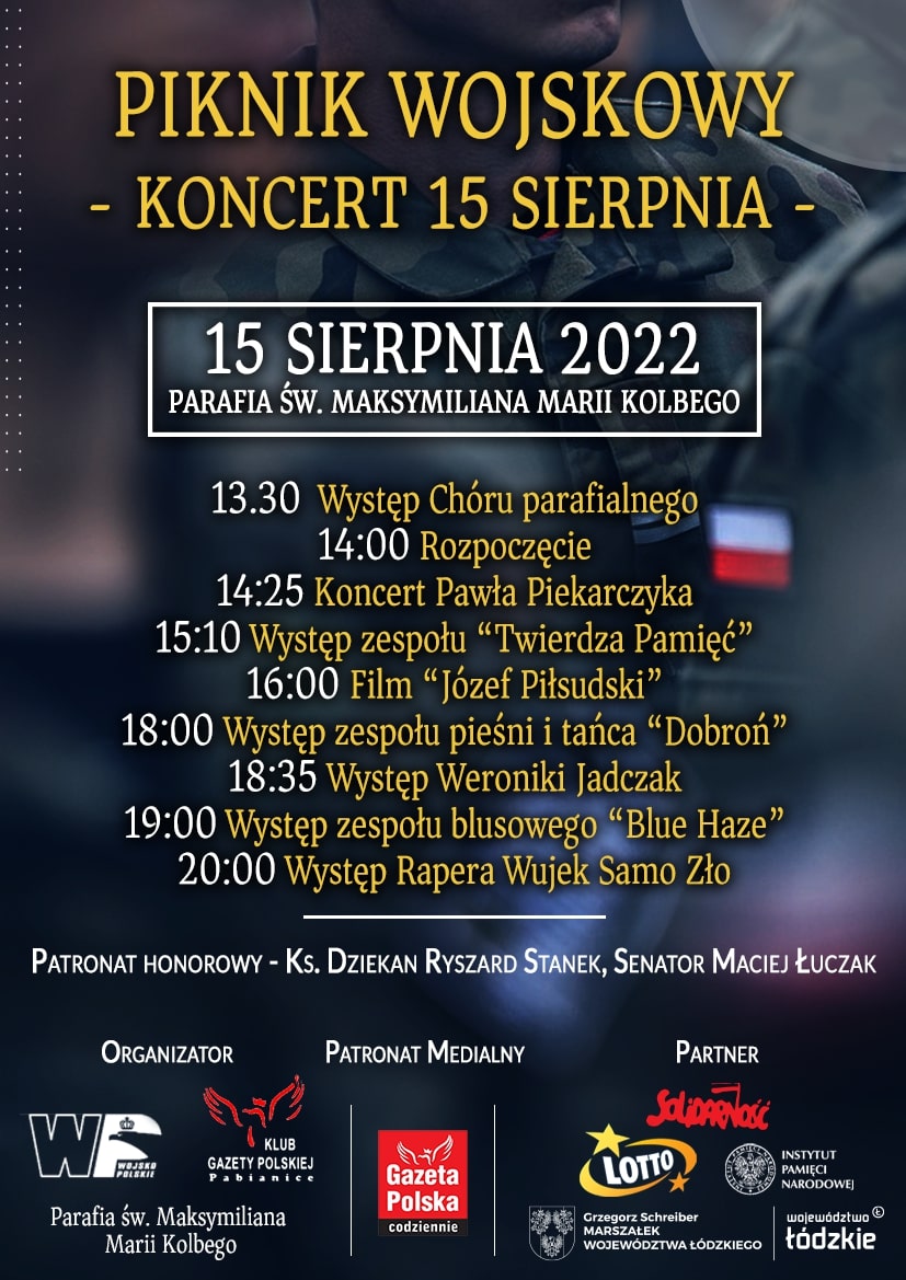 W poniedziałek, 15 sierpnia, przypada Uroczystość Wniebowzięcia NMP oraz rocznica Bitwy Warszawskiej z 1920 r. Od godziny 13.30 rozpocznie się na placu przy kościelnym Piknik Patriotyczno-Wojskowy z wieloma atrakcjami dla całych rodzin. Serdecznie zapraszamy.